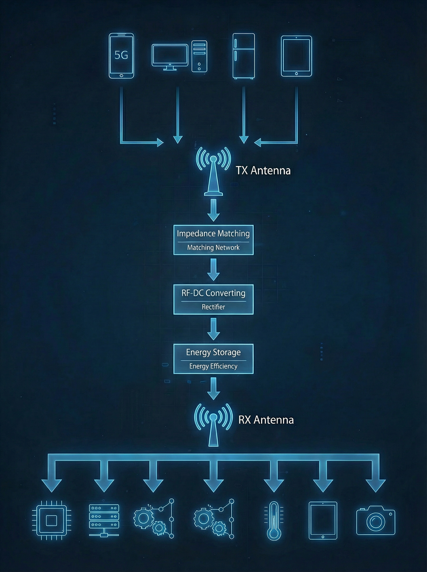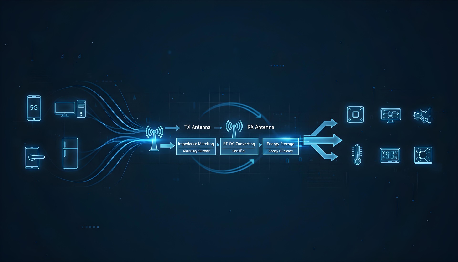 RF 에너지 하베스팅은 무선 통신이나 무선 전력 전송 등으로 전파되는 라디오 주파수(RF, Radio Frequency) 에너지를 수집하여 이를 전기 에너지로 변환하는 과정을 말합니다. 주변에서 생성되는 RF 에너지를 활용하여 작은 전자 기기나 센서 등을 구동하거나 충전하는 데 사용될 수 있습니다.